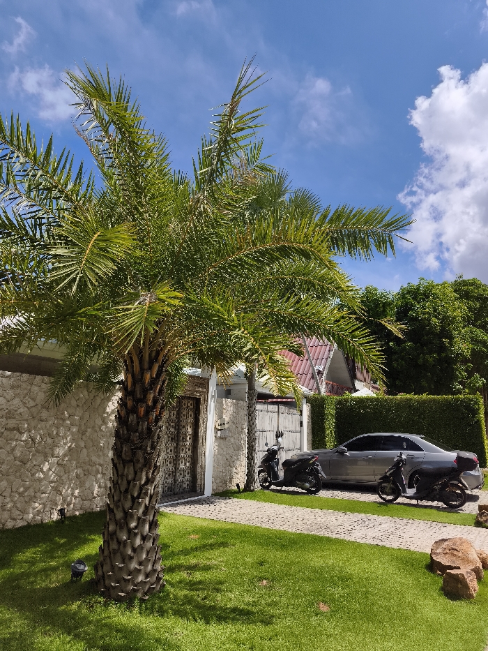 A lush green palm tree dominates the foreground, with its fronds reaching towards a partly cloudy blue sky. Behind it, a stone wall meets an ornate dark wood door. Further back, a silver car is parked beside two motorcycles on a stone-paved driveway. A manicured green lawn stretches across the foreground, punctuated by small lighting fixtures and rocks. In the background, a green hedge and the edge of a red-roofed building are visible.