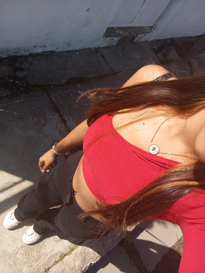 A woman stands outdoors in sunlight, viewed from above. She wears a red crop top and black pants, paired with white sneakers. A delicate gold necklace with a round pendant adorns her chest. The background is composed of concrete slabs and a light-colored wall. Her long, brown hair cascades over her shoulder. She has a mole on her chest.