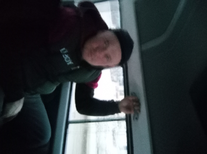 The image depicts a male individual seated inside a vehicle, looking directly at the camera. The scene is located in Bukhara, Uzbekistan. The man, appearing to be middle-aged, wears a black beanie, a dark long-sleeved top with light-colored text (possibly "ÚZOY" or similar, reversed) on the chest, and a dark, possibly padded vest over it. A reddish or maroon garment is visible on his left shoulder area. His right arm is raised, gripping a silver-colored grab handle mounted on the light-grey headliner panel above the window. The vehicle's interior features a dark overhead ceiling. Through the window behind the man, an outdoor environment suggests cold weather, with white ground cover indicative of snow or frost and indistinct background structures under an overcast sky. The overall image quality is somewhat blurry, consistent with movement or low light conditions.