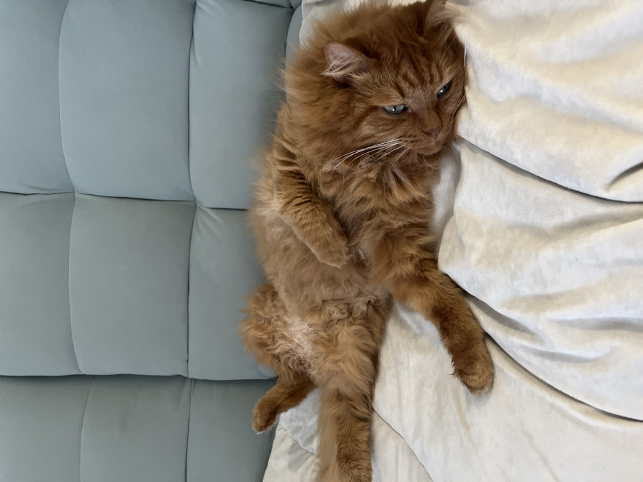 A long-haired domestic cat with reddish-brown fur, light-colored eyes, and prominent white whiskers is depicted. The cat is positioned supine on a light-colored, wrinkled comforter or duvet, with its four limbs extended outwards. Its head is angled to its right, facing towards the observer. Behind the cat's head and upper torso, a padded headboard upholstered in a light blue or teal fabric is visible. The headboard features a tufted pattern composed of recessed squares or rectangles. The scene is situated within a private interior, identified as being in the city of Nikolayevka, Russia.