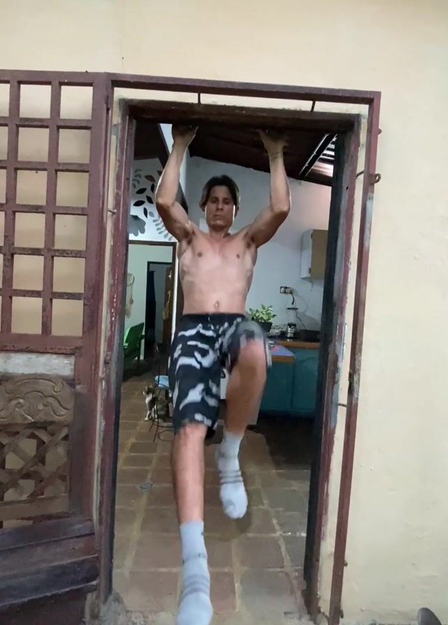 A shirtless man wearing camo shorts and white socks is performing pull-ups in a doorway. He grabs onto the top of the doorframe and hangs straight down before pulling himself up. A small dog is visible in the room behind him. A wooden bench is to the left of the doorway, and the walls of the building are a light yellow color.