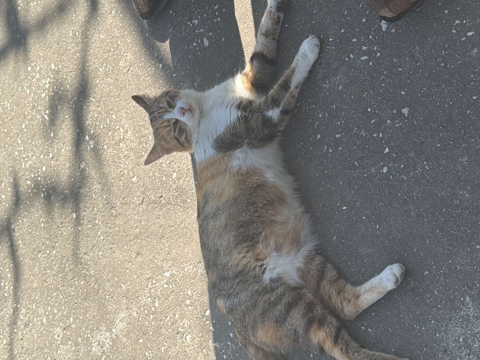 A cat lies on its back on a concrete surface in Trivoditsi, Bulgaria. The cat is calico with white, tan, and grey/brown markings. It's lying between the shadows of trees and the lower legs and shoes of a person.