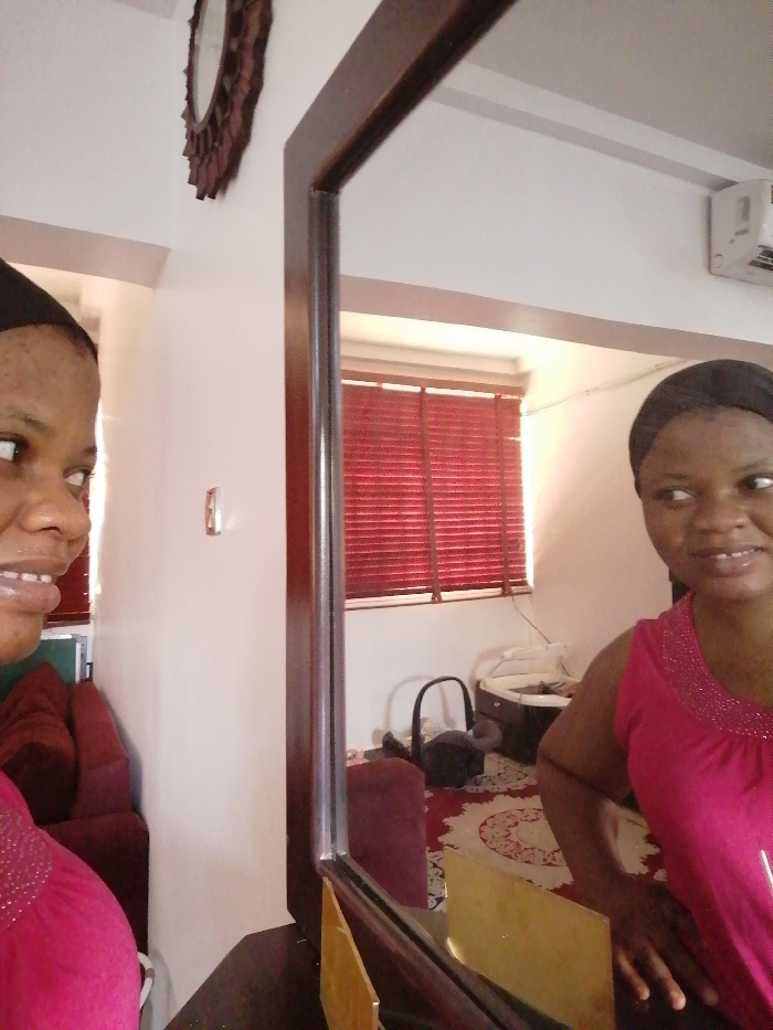 An adult female is depicted in an indoor setting, likely a residence in Abuja, Nigeria, engaging with a large, dark-wood framed mirror