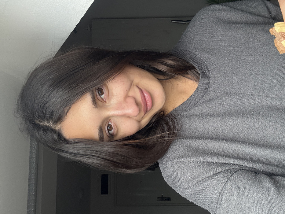 A chest-up portrait depicts a female subject indoors in Kraljevo, Serbia. The subject has dark brown, shoulder-length hair parted near the center and brown eyes, looking directly at the camera with a subtle smile. She wears a grey, long-sleeved crew-neck sweater showing fabric pilling. Her right hand, partially visible in the lower right, holds a brown, multi-layered confectionery item. The background to the left features a dark door or frame with a visible handle. To the right, a light-colored wall is visible, showing an oblique shadow or structural line, and an indistinct dark object.