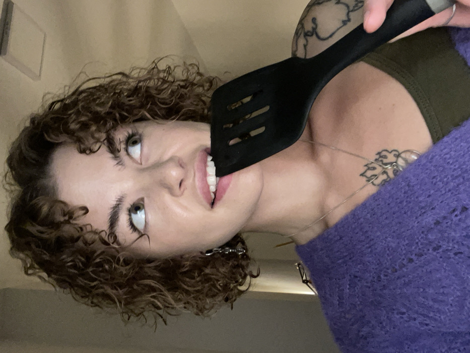 The image displays an adult female in a close-up, chest-up shot within an indoor environment. The specific location in Boreti, Montenegro, is not discernible. She possesses short, curly brown hair, light-colored eyes, and light skin, with her gaze directed upwards and to her right. She is attired in a dark olive green tank top and a light purple open-knit cardigan. A silver-toned dangle earring is present on her visible left ear, and a silver-toned necklace with a stylized flame-like pendant is worn around her neck. A partial tattoo featuring organic shapes is visible on her left shoulder. The subject holds a black slotted spatula, with its head partially inserted into her mouth, resting between her upper teeth and lower lip. The background consists of a light-colored wall and ceiling, with a rectangular ceiling fixture visible in the upper right quadrant. Illumination appears soft and diffuse.