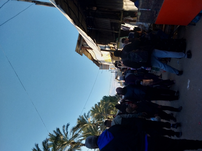A crowded street scene with many people walking. The perspective is from a low angle, looking up towards buildings on the right side of the frame and trees on the left. The sky is a clear blue. People are mostly dressed in dark clothing. A roof is visible on the right, with an awning overhanging the street. Palm trees line the left side of the street against the backdrop of the sky.