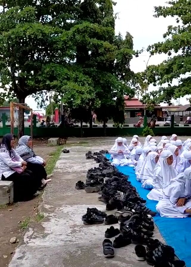 A group of individuals dressed in white robes and headscarves are seated on a blue mat in an outdoor setting. The individuals appear to be young, likely students, as they are seated attentively in rows, facing a direction out of frame. The setting is a courtyard or open space with buildings visible in the background. Several pairs of shoes and sandals are lined up along the side of the mat. Two women in the front left are sitting on a concrete block, observing the group. There is a large tree in the foreground. The weather appears to be overcast or cloudy.