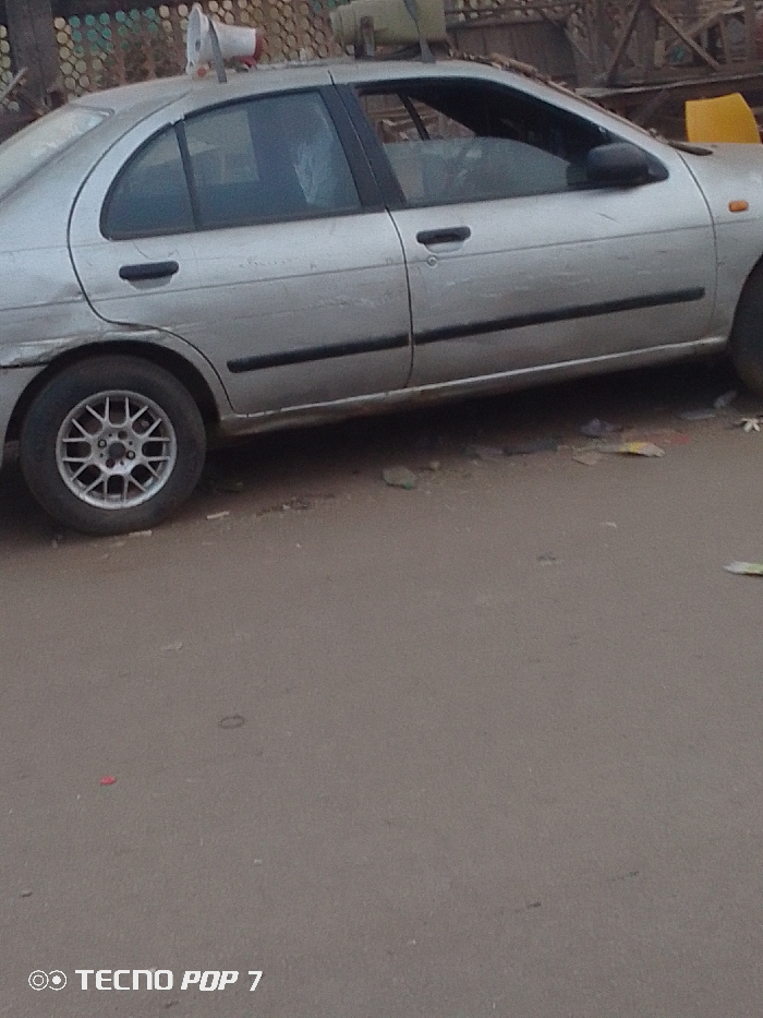 A silver, four-door sedan sits angled on a worn asphalt surface. The car has black trim and aftermarket wheels. Two large speakers are mounted on the roof. The car’s body shows signs of damage near the rear wheel. Debris litters the ground around the vehicle. A watermark for "TECNO POP 7" is visible in the lower left corner of the image.