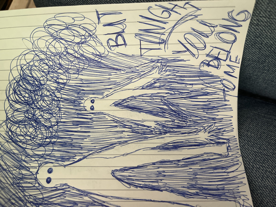 The image displays a close-up, overhead view of a drawing rendered in blue ballpoint pen on a piece of white, horizontally lined notebook paper. The paper appears slightly curled or creased and rests upon a textured blue denim surface, visible at the bottom and along the right edge. The drawing features two stylized, slender humanoid figures. Both figures are depicted with blank white bodies and dark, circular eyes on oval-shaped heads. The figure on the left is taller, with its lower body partially obscured by vertical blue pen strokes. The figure on the right is shorter and is centrally positioned, surrounded by a dense background of chaotic blue pen scribbles and vertical lines that give the impression of shadows or abstract foliage. In the bottom right quadrant of the drawing, handwritten text in blue pen reads "BUT TONIGHT YOU BELONG TO ME." The words are rendered with varying stroke weights. No visual evidence within the image indicates a specific location within the city of Ruse, Bulgaria.