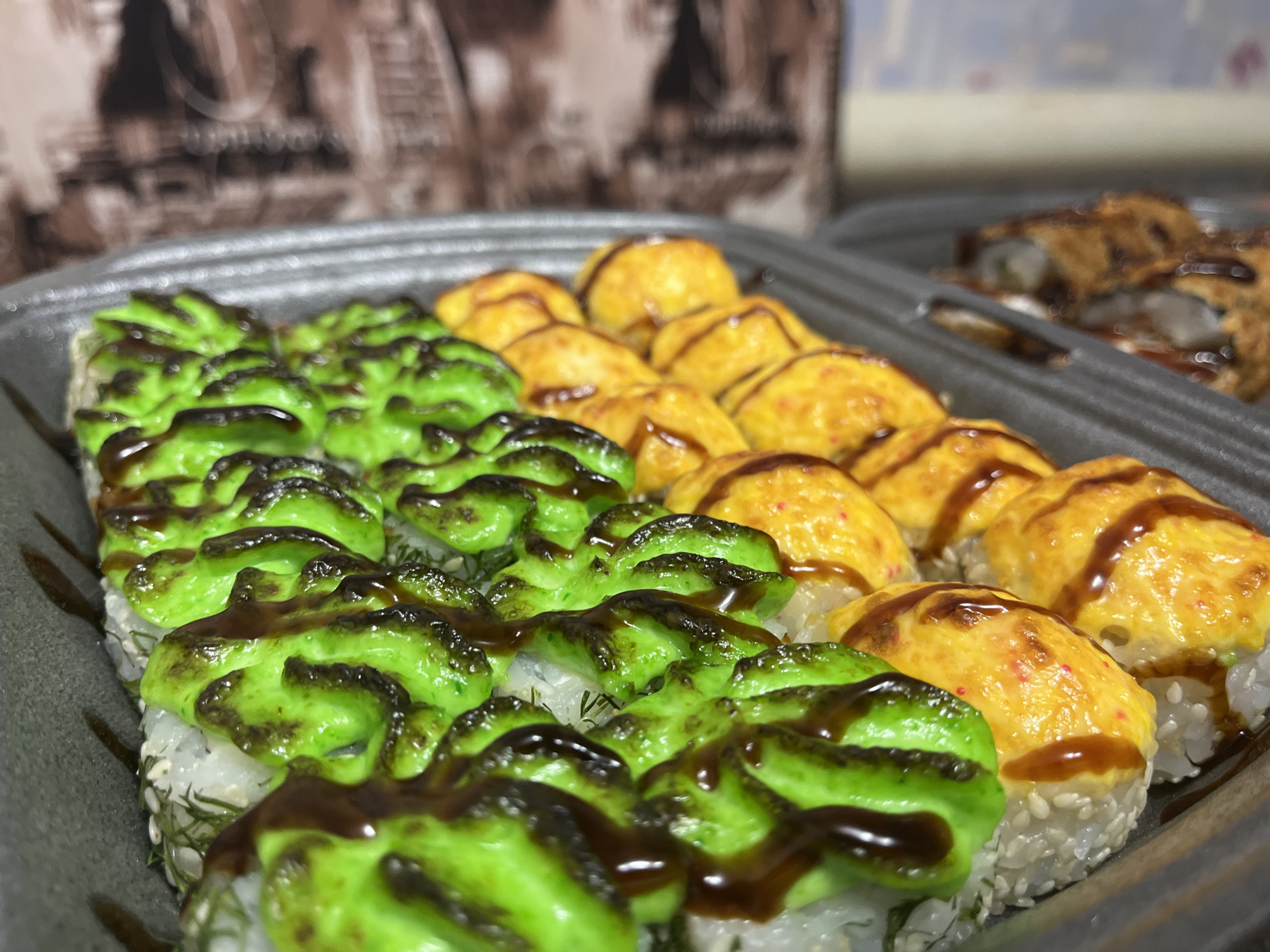This image captures a close-up view of three varieties of sushi rolls presented in dark gray, multi-compartment take-out containers, presumably located in Kuyeda, Russia. In the foreground, two distinct types of sushi rolls are arranged. The left section contains numerous rolls topped with a vibrant green, textured sauce, over which a darker brown, glossy sauce is drizzled. These rolls are primarily composed of white rice, with some visible green herbs or finely chopped ingredients embedded on their sides. The right section displays an equal number of rolls featuring a bright orange-yellow, somewhat mottled topping, also with drizzles of the same dark brown sauce. The sides of these rolls are visibly coated with white sesame seeds on a base of white rice. Further in the background, to the right, a third type of sushi roll is partially visible and out of focus within another compartment of a similar container. These rolls appear to be deep-fried or tempura-battered, characterized by a crispy, light brown exterior, also adorned with dark brown sauce drizzles. The background is uniformly out of focus, suggesting an indoor setting. An indistinct brown-toned object with a subtle pattern occupies the upper left portion of the background, while a lighter, uniform surface is visible in the upper right. No individuals or specific actions are depicted within the frame.