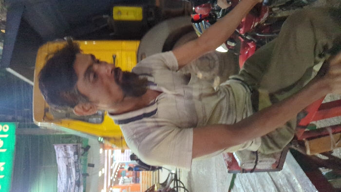 A man with a beard works on a vehicle, possibly a motorcycle or scooter. He wears a light-colored, short-sleeved shirt and dark pants. The vehicle is partially visible and appears to be in a repair or maintenance setting, with some tools and equipment nearby. A yellow truck is in the background. The scene is set outdoors, possibly in a street or workshop area.