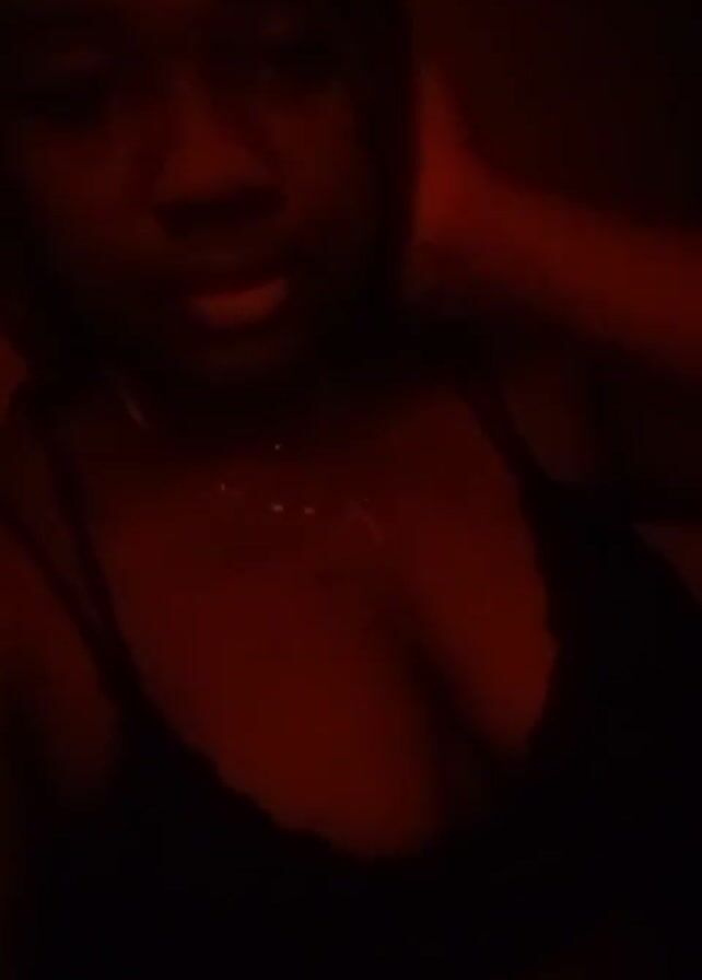 A woman with dark skin is sitting in a dark room lit by a red light. She is wearing a black tank top and a delicate necklace with a cross pendant. Her hand is visible on the back of her head, and she is looking directly at the camera.