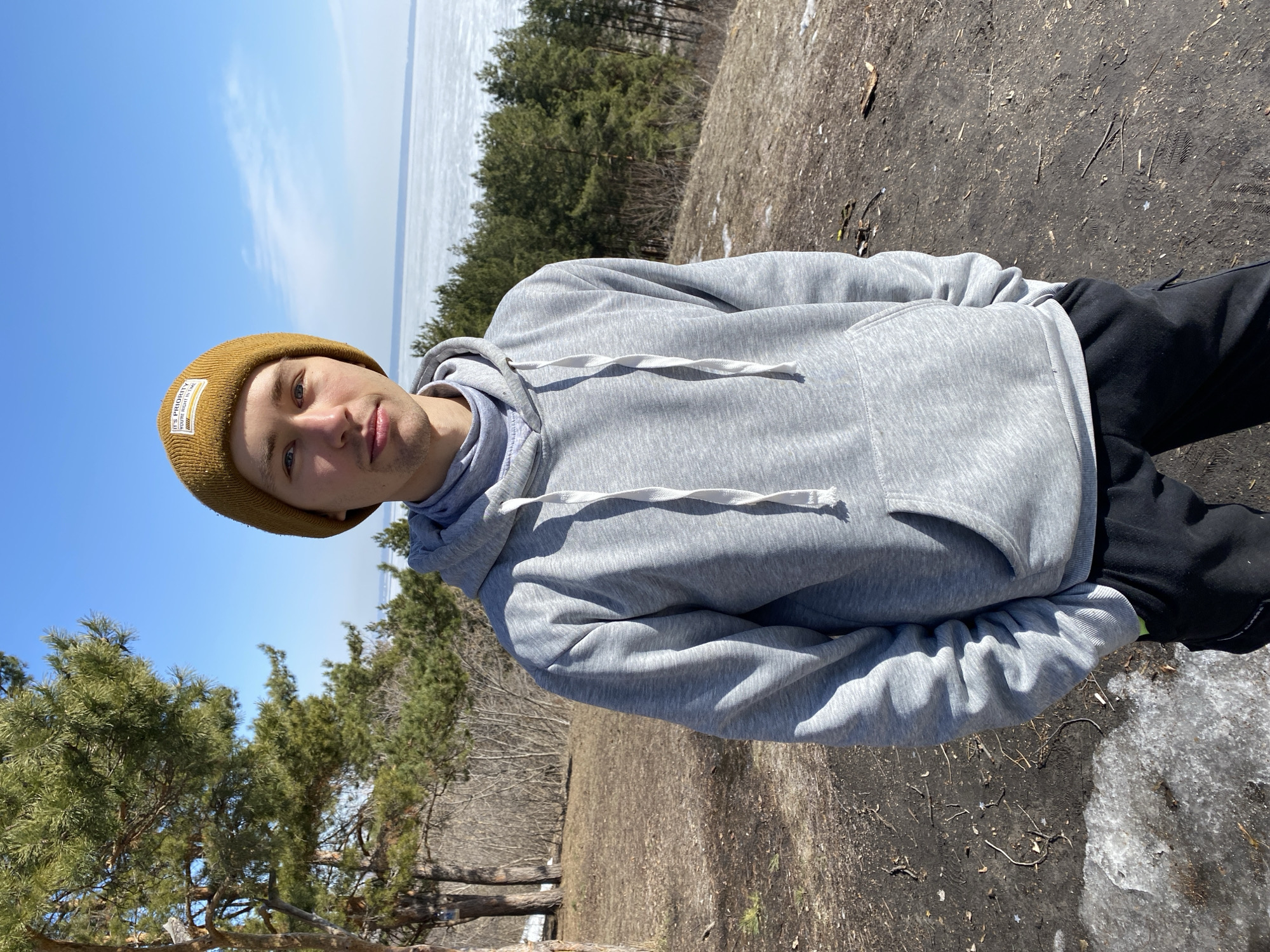A young man in a gray hoodie and mustard-colored beanie stands on a dirt bank, likely overlooking the Volga River in the city of Ulyanovsk, Russia. The river is partially frozen, visible in the background along with coniferous trees. The ground near the man has patches of ice and dirt. The sky is blue with some scattered clouds.