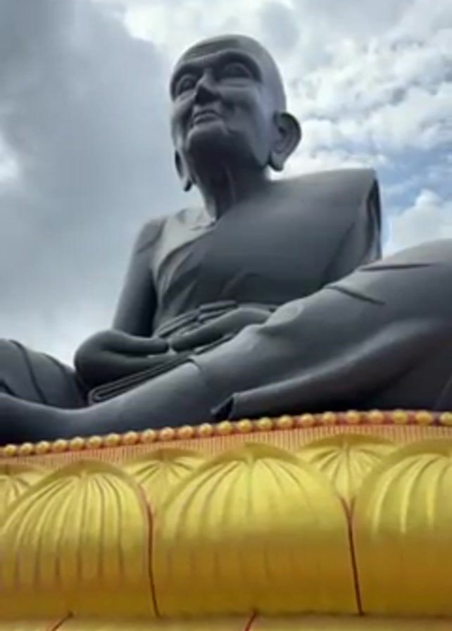 A low-angle shot shows a large, dark-colored statue of a meditating monk sitting on a gold-colored lotus platform