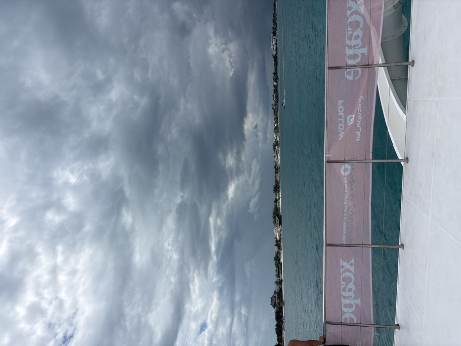 The image depicts a panoramic view from the deck of a boat looking towards a distant coastline under an overcast sky. The sky is dominated by dense, dark grey clouds indicative of stormy weather, with lighter grey clouds also present and a small patch of blue sky visible in the upper left. The foreground consists of a white boat deck with a metal railing. A red fabric banner, displaying mirrored text and logos, is affixed to the railing. Visible mirrored text includes "xcape", "DESCUBRE LA EXPERIENCIA", and "FOLLOW @xcape_lat". A white curved structure, possibly part of a slide or boat hull, is visible on the far right of the deck. On the far left, the partial torso and left arm of an individual in a dark garment are visible, resting on the railing. Between the boat and the coastline lies a body of turquoise-blue water with a gently rippled surface. In the mid-distance, a white motorboat with a visible wake travels leftward. The distant coastline features a white sandy beach with scattered low-rise buildings and interspersed vegetation, consistent with tropical architecture. One prominent building on the left has a distinct dark, multi-tiered roof. This scene is identified as being in Cancún, Mexico, based on the tropical environment and the brand "xcape" visible on the banner, which is associated with tours and activities in the region.