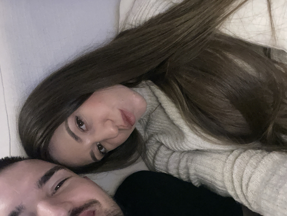 An indoor, close-up portrait features two individuals. The specific location within Sofia, Bulgaria, cannot be determined from the visual evidence. On the left, the upper left quadrant of a male's face is visible, including his left eye, part of his nose, and a dark mustache and beard. He has short dark hair and wears a dark garment. To his right, a female with long, straight, dark brown hair occupies the majority of the frame. She possesses fair skin, dark eyes, and her lips are deliberately pursed in a pouting expression, directed towards the camera. She wears a cream-colored, ribbed turtleneck sweater with integrated metallic threads. A thin necklace is faintly visible over her sweater. The subjects are positioned closely together, indicative of a selfie or intimate pose. The background is a plain, light-colored surface, typical of an indoor environment under consistent artificial lighting.