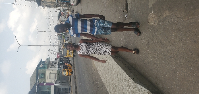 The image displays an urban street scene in Lagos, Nigeria, under an overcast sky
