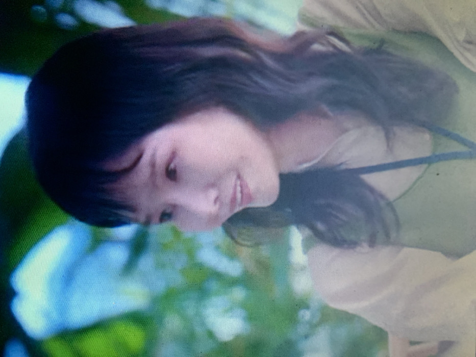A woman with dark, wavy hair and bangs is captured in a close-up shot. She's wearing a light-colored top and a lanyard with a blue strap. Her head is tilted down and to the side, and she appears to be smiling subtly. The background features blurred greenery with hints of blue sky, suggesting an outdoor setting. The image quality is somewhat grainy.
