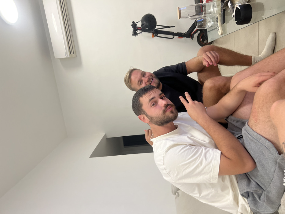 two adult males seated on a light-colored sofa within a residential interior. The male positioned on the left, with short dark hair and a beard, wears a white short-sleeved t-shirt and gray athletic shorts. He faces the camera, displaying a peace sign with his left hand while maintaining a subtle smile. The male on the right, with short blonde hair and a clean-shaven face, wears a black short-sleeved t-shirt and black shorts. He is seated with his left arm around the first male's shoulder and smiles broadly towards the camera. In the foreground, a glass coffee table is present, holding a clear glass carafe with a wooden lid, two clear glass tumblers, a white remote control, and a black ashtray with a lighter. The background consists of a white wall, featuring a mounted split-system air conditioning unit in the upper right. Below the air conditioner, a black and red electric scooter with a black helmet hanging from its handlebars is parked against the wall. A doorway leading to a darker interior space is visible in the upper left background. The floor is covered with light-colored tiles. The scene is located in a residential area of Unknown, Unknown.
