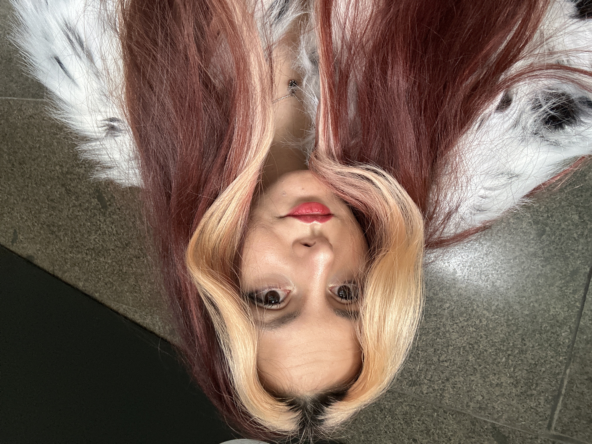 A female individual is depicted in a close-up, chest-up portrait, facing the viewer directly. She possesses long, wavy hair, predominantly dark reddish-brown, with distinct, lighter blonde or strawberry blonde sections framing her face. Her eyes are dark brown, and her lips are full, coated in red lipstick. She is attired in a white, textured garment, resembling faux fur, exhibiting some dark, possibly black, markings. A silver-colored chain necklace with a dark, heart-shaped or rounded pendant rests upon her chest. Her right hand is partially obscured by her hair, appearing to be near her chin. The background consists of a light gray, granular, tiled surface to the left, likely granite, contrasting with a smooth, dark gray or black panel to the right. This environmental configuration of tiling and dark panels is consistent with the interior architecture of public spaces in Sofia, Bulgaria, such as a metro station concourse, platform, or pedestrian underpass. No specific signage or unique architectural features are present to precisely identify the exact location within the city.