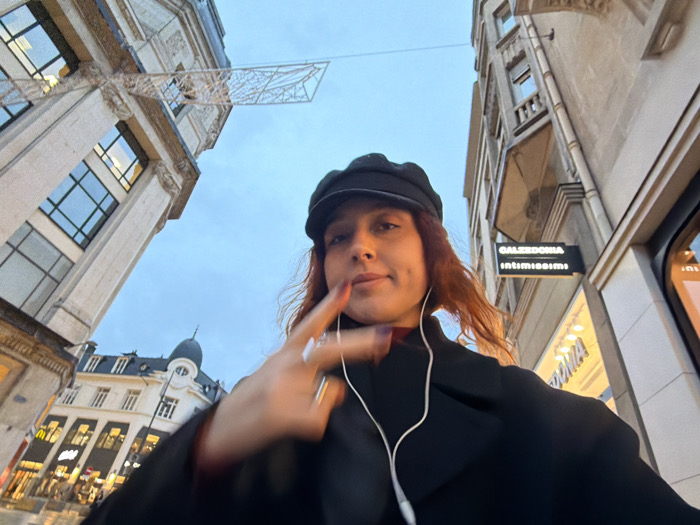 A woman, wearing a black cap and coat, poses for a selfie on a city street. She has headphones in and is holding up a peace sign. Buildings flank the street, with the signage for "CALZEDONIA intimissimi" visible on one side. Across the street, light spills from a McDonald's. Decorations hang overhead. The sky is overcast.