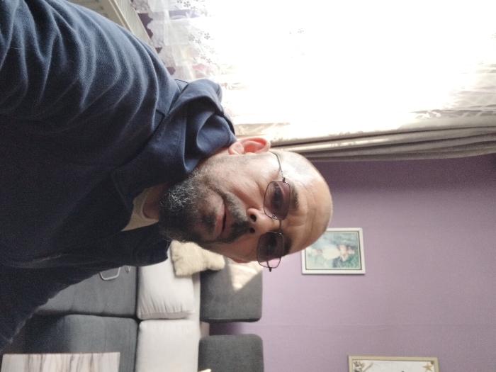 The image portrays an indoor scene, specifically a domestic setting, located in the city of Levski, Bulgaria. The primary subject is an adult male, visible from the chest up, positioned slightly to the right of the frame's center. He has a shaved head and a dark stubble beard and mustache, and wears rectangular-framed glasses with dark lenses. His attire consists of a dark blue hooded zip-up jacket over a light-colored undershirt. He is looking directly towards the camera. The background features a light purple-colored wall. To the subject's left, a window is heavily overexposed by bright natural light, revealing light-colored sheer curtains with a subtle pattern and a white radiator directly beneath it. To the subject's right and behind him, a grey sectional sofa with light-colored (white/off-white) cushions and pillows is visible. Two framed pictures adorn the purple wall; one on the left depicts a young girl in a white dress, and a second, partially visible framed item with a gold-colored border, is to its right. A portion of a light-colored, patterned table is visible in the bottom right foreground. The scene depicts no explicit action or interaction beyond the subject's direct gaze at the camera.