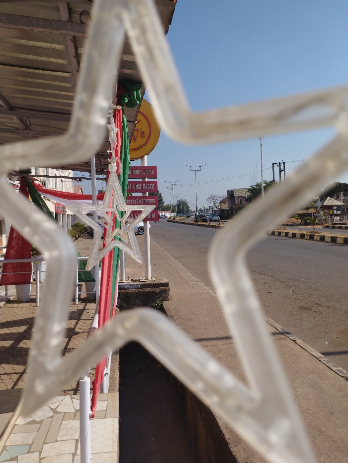 The image displays a daytime street scene in Gura Top, Nigeria, viewed through a large, translucent five-pointed star ornament partially obscuring the immediate foreground