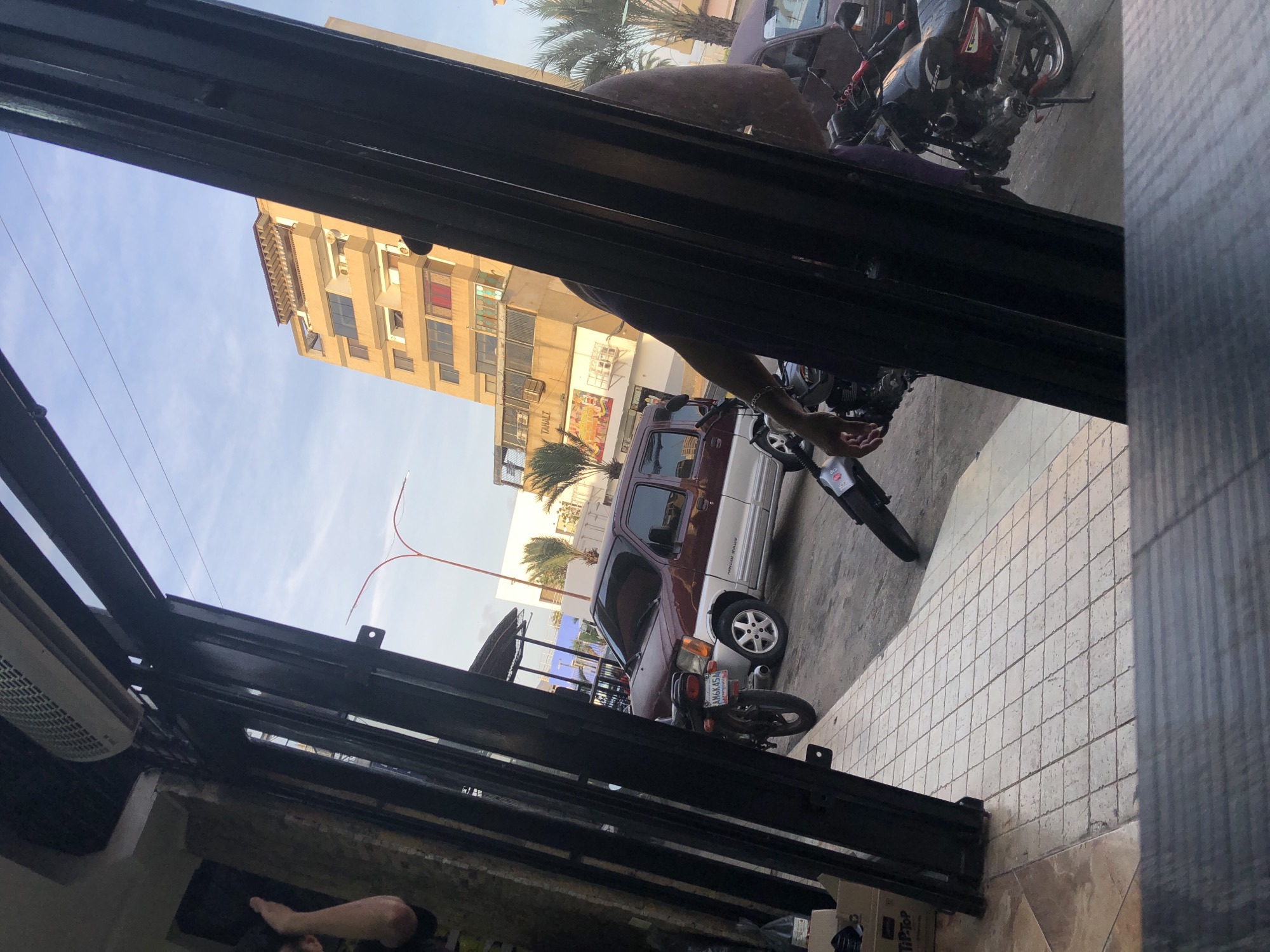 The image, taken from an indoors perspective looking out through a partially open metal gate, shows a street scene in Juan Griego, Venezuela