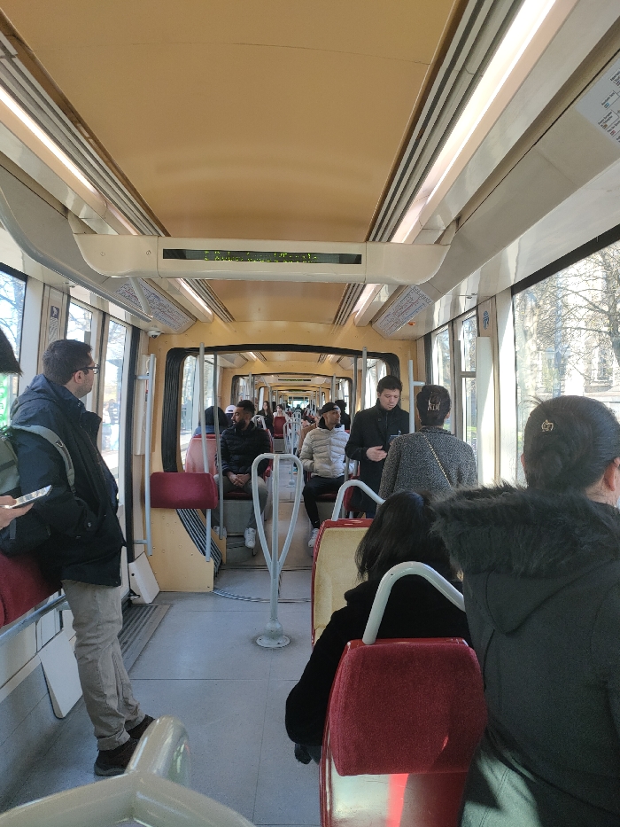 - "The image displays the interior of a tram in Strasbourg, France, identified by the illuminated digital display board indicating "Place de l'Homme de Fer" by FM-tMAHv2, licensed under CC BY 4.0