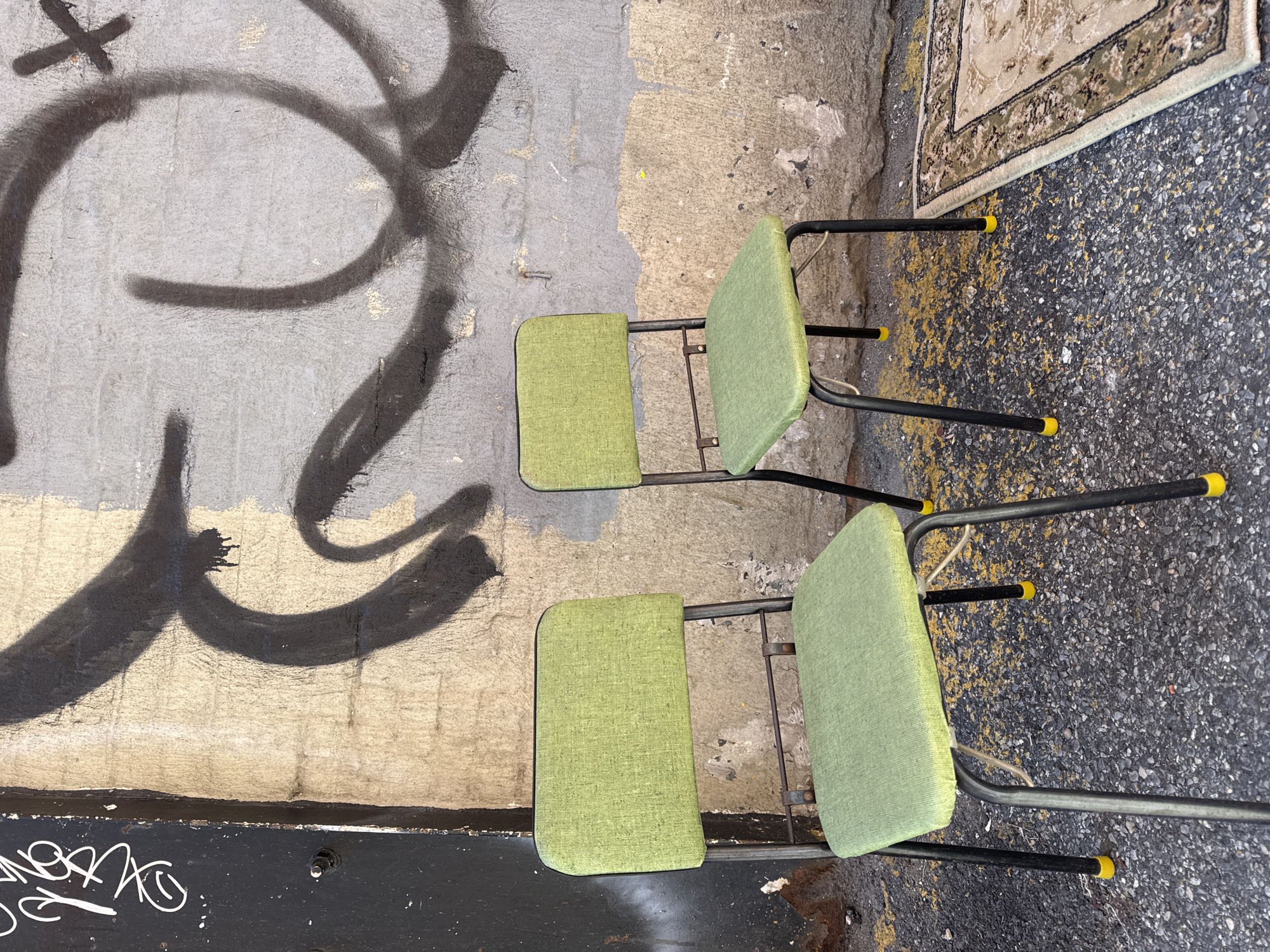 two green padded chairs with black metal frames, positioned near a wall covered in graffiti