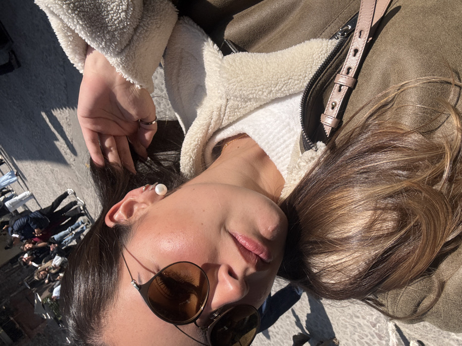 A fair-skinned person reclines outdoors, basking in sunlight. Round sunglasses obscure the eyes. A large pearl earring adorns one ear. The person wears a white sweater under a light brown shearling-lined jacket. Brown hair, highlighted with blonde streaks, cascades beside the face. A silver ring is visible on a finger resting near the head. A crowd of people can be seen in the background. The textured ground suggests a stone or paved surface.