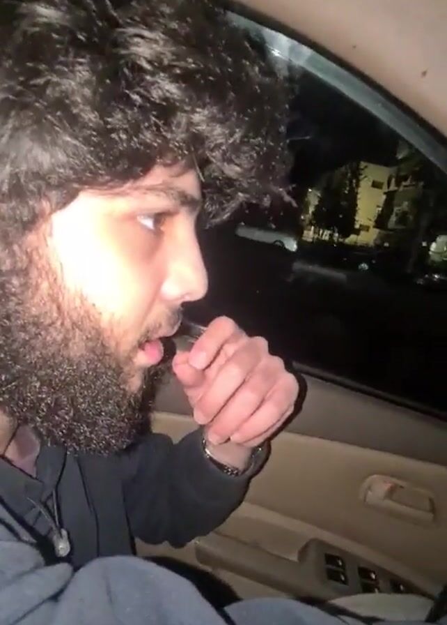 A man with dark curly hair and a beard drives a car at night. The interior of the car is beige, and an aftermarket touch-screen is visible on the dashboard. A golden eagle and other ornaments hang from the rearview mirror. The man is looking off to the side and speaking. The man puts the cigarette between his lips and drives along the road, lights visible in the distance.