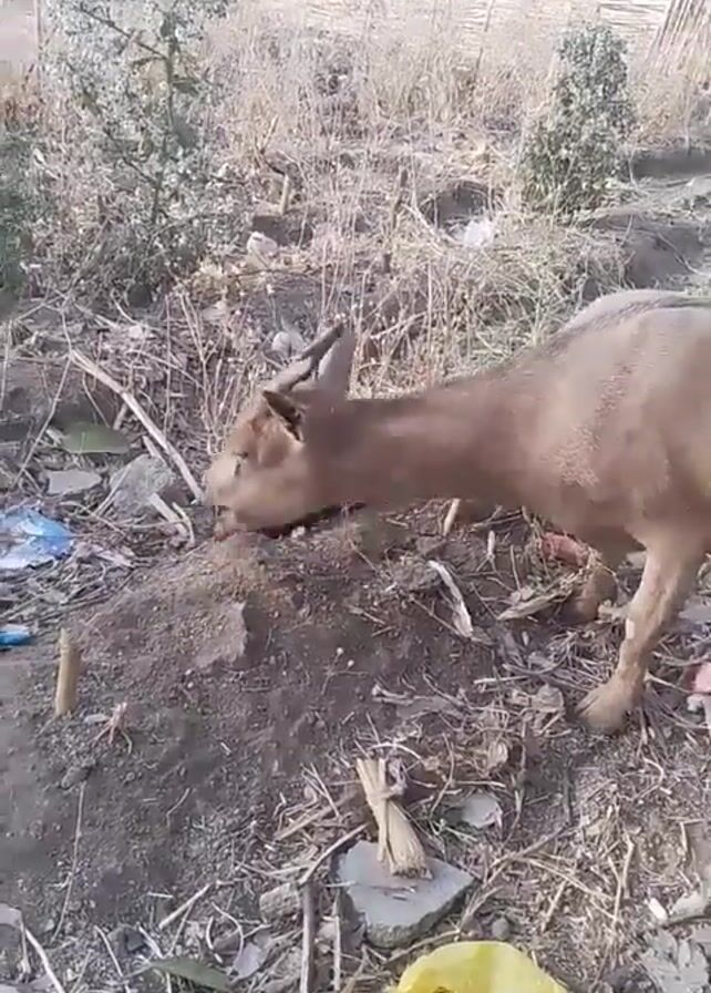 A tan-colored goat stands in a field of dry grass and litter, eating something on a mound of dirt. The goat moves around the mound, continuing to eat. There's trash scattered around, including a yellow plastic bag and pieces of blue plastic. In the background, there are bushes, a fence-like structure, and part of a building. The goat appears to be scavenging in a rather unkempt area.