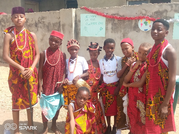 A group of eight children are dressed in what appear to be traditional Nigerian outfits, likely for a cultural event
