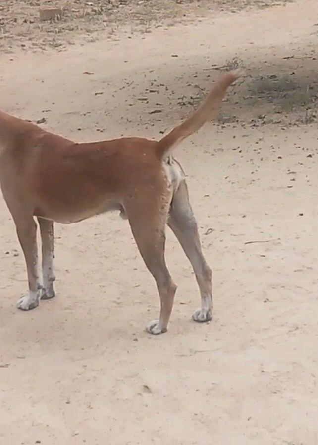 medium-sized, short-haired brown dog standing on sandy ground. The dog has white markings on its paws. There is a tree in the background to the right, with a white sack hanging on it. The dog looks to the left, then turns its head to look directly at the camera. There is a chirping sound in the background.