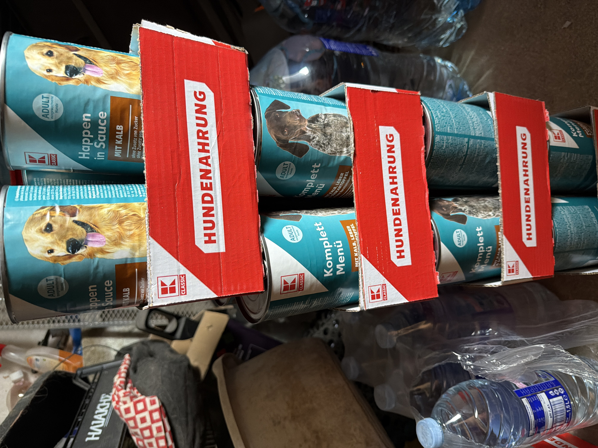 The image depicts an indoor storage area in Chirpan, Bulgaria, characterized by a vertical stack of red and white cardboard boxes filled with dog food cans. Each visible box is labeled "KLASSIC" and "HUNDENNAHRUNG" (German for dog food) in white text. The cans in the uppermost box feature a Golden Retriever on their turquoise and white labels, along with text indicating "ADULT Happen in Sauce MIT KALB" (with veal). Cans in the lower visible boxes display a German Shorthaired Pointer and the text "ADULT Komplett Menü MIT KALB, LEBER, KARTOFFEL" (with veal, liver, potato). To the left of the stacked dog food, a dark object is partially covered by a red and white checkered fabric. Further left, a dark item bearing white Cyrillic text, potentially "НАІАКНZ", is partially visible. In the background to the right of the dog food stack, multiple clear plastic bottles of water are present, some packaged in plastic bags. One bottle prominently displays "1.5 LE" and "pH 7.41" with Bulgarian text. The floor surface appears to be a uniform, muted color. No people or active interactions are visible within the scene.