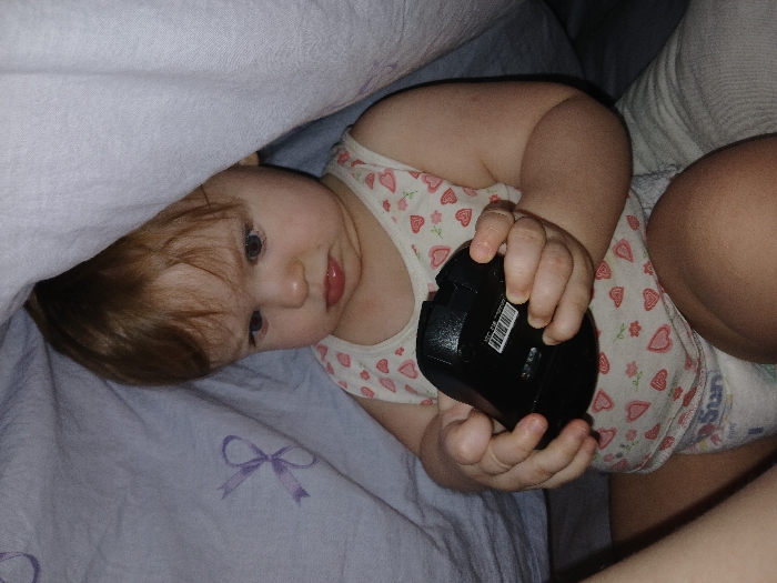 An infant is depicted in a close-up, indoor setting within the city of Krasnodar, Russia. The individual has light brown hair, fair skin, and appears to be in an upright or seated position, partially obscured by a light blue fabric covering that features a purple bow pattern on its left side. The infant wears a white sleeveless top patterned with small red hearts and green leaves, and a disposable diaper with "Sun" text visible. Both hands grasp a black, somewhat rectangular electronic device, possibly a battery pack or large computer mouse, with a white label containing a barcode and text visible on its underside. The infant's gaze is directed downwards and to the right, exhibiting a solemn expression with slightly pouted lips. A limb, possibly an adult's arm or leg, is partially visible on the far left of the frame. The immediate environment appears to be an enclosed space, likely under a blanket or within bedding.