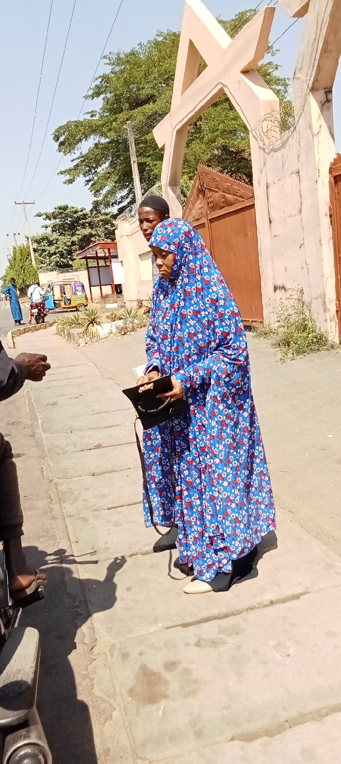 The scene depicts an outdoor street environment in Kaduna, Nigeria, under bright daylight. In the midground, a woman wearing a blue floral abaya and black flat shoes holds a black clutch bag with a gold clasp. Her attention is directed towards the left, interacting with a partially visible individual whose hand is extended towards her. Behind her, a man wearing a black kufi looks towards the left. The ground consists of a light-colored paved sidewalk with visible shadows cast by the subjects and an unseen light source. In the background, a distinctive light-colored concrete archway, appearing to form geometric letters (possibly "AX"), stands over a closed brown metal gate. Beyond this gate, a road is visible, featuring a yellow and blue auto-rickshaw (Keke Napep), a motorcycle, and several pedestrians. Utility poles with power lines and green trees are present against a clear, light blue sky. A small structure with a red roof is also discernible in the distance along the road.