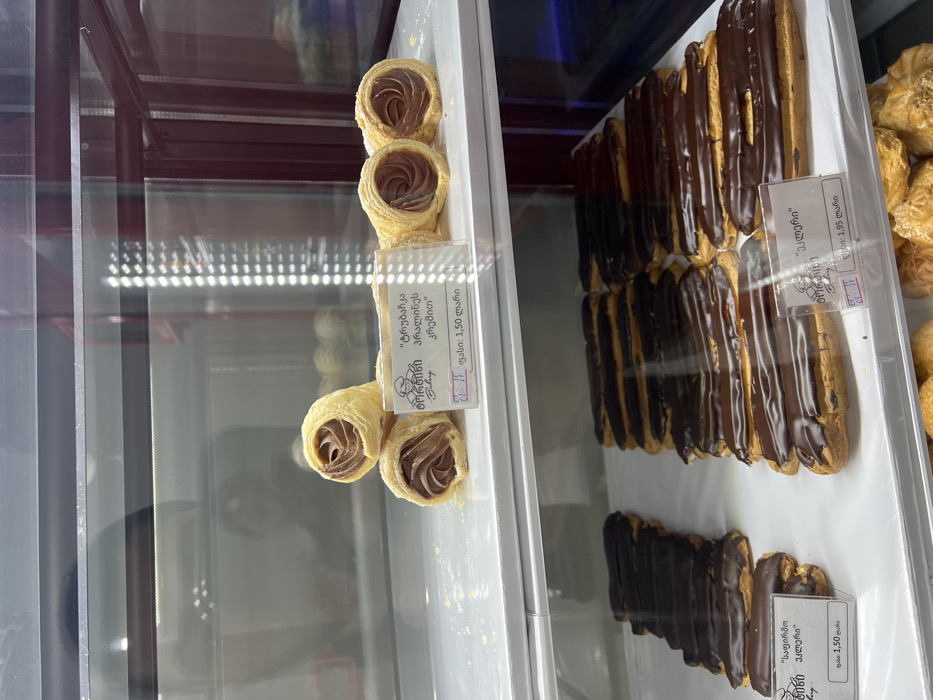 - "The image displays a refrigerated glass bakery display case within a retail establishment in Tbilisi, Georgia, identified by Georgian text "თბილისის Bakery" and the "ლარი" currency on price tags" by FM-QWs9h1, licensed under CC BY 4.0