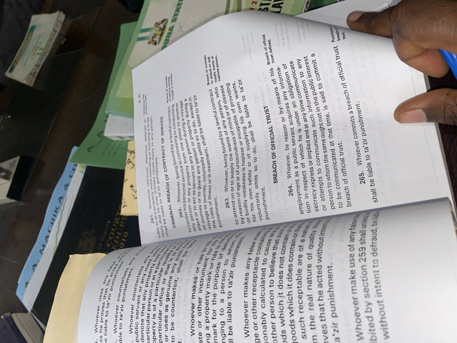 This image, located in Kabala, Nigeria, depicts an overhead view of an open legal textbook resting on a dark, reflective surface, likely a desk