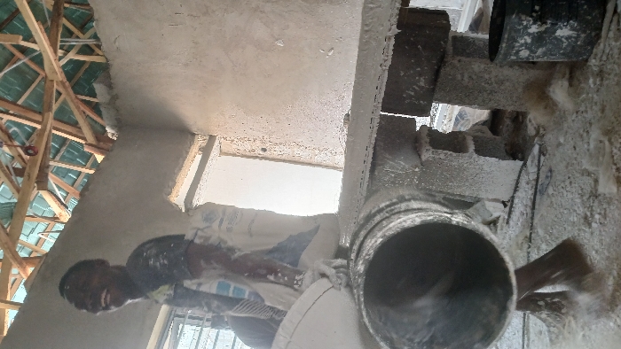 The scene depicts the interior of a building under construction or renovation in Unknown, Unknown. A single dark-skinned male individual, wearing a dark, white-splattered t-shirt, is positioned on the left side of the frame. He is smiling broadly, looking upwards and to his left. He is actively engaged in work, holding a white bucket in his left hand from which a white, powdery or liquid substance is spilling downwards. A large white sack, likely containing building material, rests on his left shoulder and back. In the foreground, a large, dark grey cylindrical pipe, coated with white residue, is angled across the lower-mid portion of the image. Directly in front of the man is a makeshift workbench or platform, constructed from two grey concrete blocks supporting a flat plank, all heavily coated in the white substance. The floor is covered with white dust, debris, and fibrous material. A dark bucket rests on the floor to the lower right. The walls of the room are unpainted, appearing to be freshly plastered or awaiting finishing, with visible texture and splatters of the white material. Natural light enters through a window with a metal grate behind the man and an open doorway or archway in the background. Overhead, the roof structure is exposed, revealing wooden trusses supporting green corrugated metal sheeting.