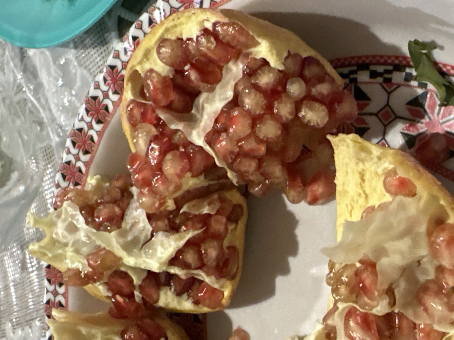 - "The image depicts multiple segments of a ripe pomegranate arranged on a white plate with a patterned rim" by FM-lh4BM2, licensed under CC BY 4.0