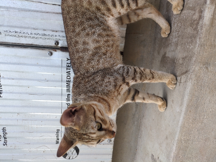 - "An adult domestic cat, displaying brown, beige, and dark striped tabby markings, is observed standing on a light grey concrete surface in an outdoor setting within Tiruvannamalai, India" by FM-M0G9X2, licensed under CC BY 4.0