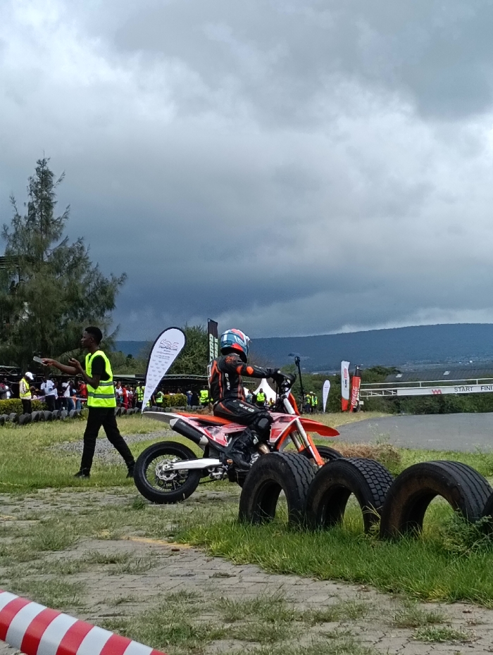 The image depicts an outdoor motorcycling event in Matathani ward, Kenya, under a heavily overcast sky
