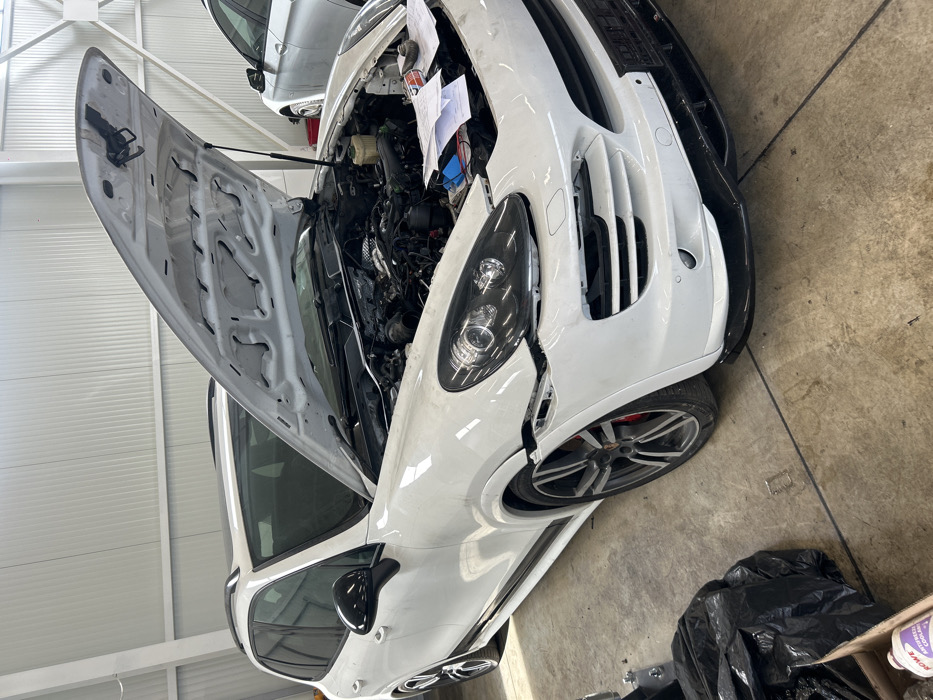 The scene, located in a service bay in Tsaratsovo, Bulgaria, features a white Porsche Cayenne SUV. The vehicle's hood is open, revealing a partially disassembled engine bay with visible components, wires, and hoses. Technical documents are placed on a component within the engine bay on the passenger side. The front bumper on the driver's side is detached from the fender, exposing underlying structures, and the front grille is missing its license plate. The SUV is equipped with multi-spoke alloy wheels and red brake calipers. The interior environment consists of white, horizontally corrugated metal walls and ceiling, and a stained concrete floor. In the foreground, to the left of the vehicle, a black trash bag and a cardboard box containing a bottle of 'ROWE ANTIFREEZE COOLANT' are visible. A second, silver-colored vehicle is partially visible in the background. No individuals are present.