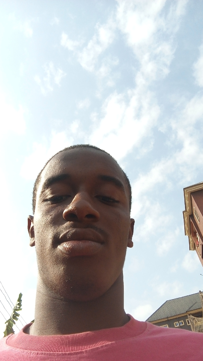 A low-angle selfie depicts a single male individual outdoors in the city of Unknown, Unknown