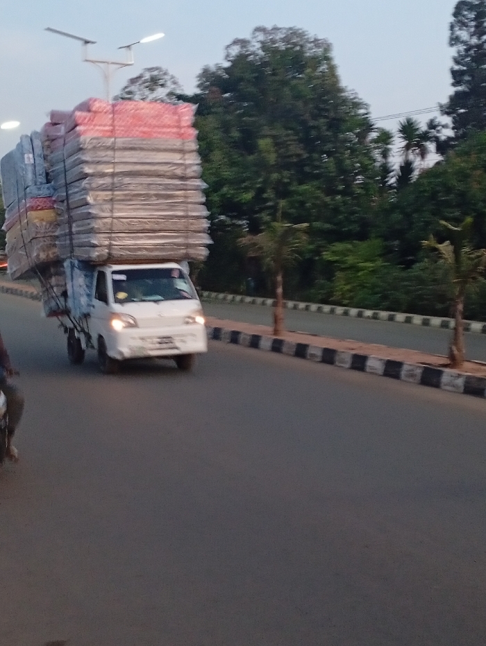 - "A white truck is heavily laden with a towering stack of mattresses and other goods, tightly secured with rope or straps" by FM-Udvu72, licensed under CC BY 4.0