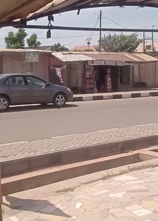 street scene under a metal awning. A gray car drives from right to left along the road. On the right side of the road, there are small shops with metal roofs. Further down the road, there are fenced houses with trees visible over the fences. The road is paved and has a painted median line. The sidewalk is paved with a patterned design. The sky is clear and bright.