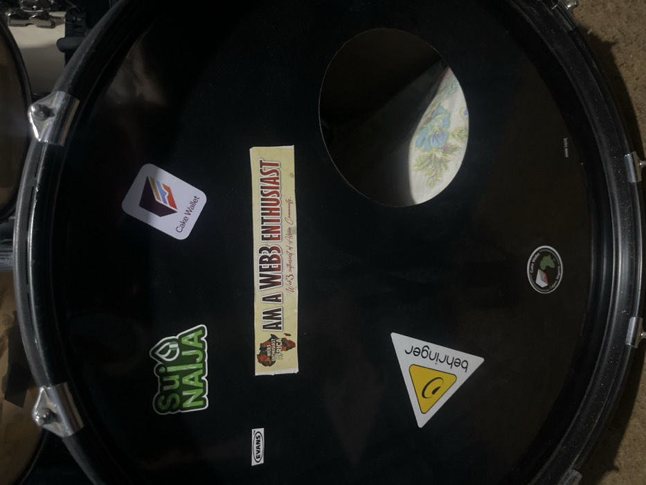 A black drumhead features various stickers. "Cake Wallet", "Sui Naija", and "EVANS" are visible, along with a vertical sticker stating "AM A WEB3 ENTHUSIAST" with an "Africa" logo. A yellow triangle sticker shows the word "behringer" rotated. A round cutout is present on the upper right of the drumhead, reflecting a floral-patterned object inside. A small circular sticker is also seen on the upper right side of the drumhead. The drumhead is surrounded by a black rim with metal hardware.