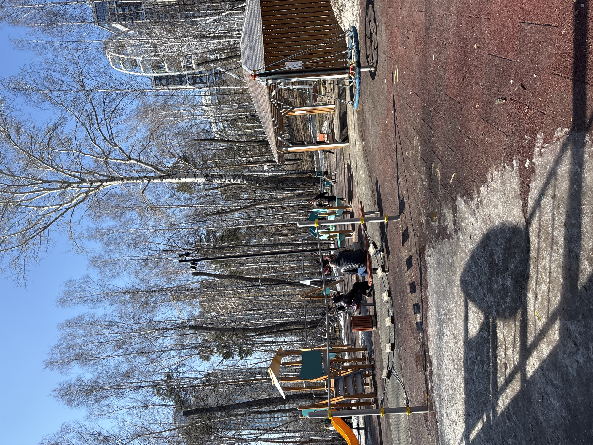 This photograph depicts a playground and fitness area in what appears to be a park setting in Yekaterinburg, Russia. The scene is shot during the daytime, likely in late winter or early spring, indicated by bare trees and patches of remaining snow on the ground. In the foreground, there are various playground structures, including a slide and climbing apparatus. Adjacent to the playground is a fitness area with equipment designed for outdoor exercise. Several individuals can be seen utilizing the equipment, suggesting the area is actively in use. The structures have a metal construction with yellow accents. Beyond the immediate play and fitness areas, the background consists of a dense stand of birch trees with their characteristic white bark. Further in the distance, modern buildings are visible, anchoring the scene within an urban or suburban setting. The ground surface is a reddish-brown material, likely a form of safety surfacing commonly used in playgrounds. Shadows from trees and structures are cast across the ground, adding depth and dimension to the scene.